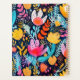 Personalisieren Sie diesen skurrilen Planer mit Ihrem Namen in dunkelblau kursiv gerahmt durch ein weißes Rechteck, auf einem kühnen, farbenfrohen Hintergrundmuster von handbemalten Blumen und botanischen Elementen in den Farbtönen Türkis, Rosa und Gelb.