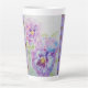 Handgemalte Design Lila Pansy-Stiefmütterchen Latte Tasse. Ein wunderschönes Blumendesign in Aquarelltönen. Entworfen aus meinen ursprünglichen Aquarellbildern, die ich aus meinem eigenen Blumengarten gemalt habe.