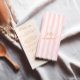 Ein buntes Retro funky moderne rosa und orange und cremefarbene Menü geschrieben . Und handgezeichnete grüne Pinstreifen auf der Rückseite. Perfekt und passend zur Suite. Hochzeitsmenü. Das Design ist schick, Vintag cremefarben und orangefarben.