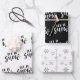 Set von 3 Designs in Schwarz und Weiß, Weiß und Schwarz und Grau und Weiß. Zwei der Designs haben handgeschriebene Schrift, die lautet "lass ist Schnee" und die andere hat ein Muster von Herz und Schneeflocken. Ideal für einfache, minimalistische Weihnachtsgeschenk-Verpackung.