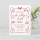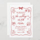 Quirky Hand Gezeichnet Whimsical Wedding Einladung. Dieses künstlerische und spielerische Design ist perfekt für Paare, die ihren großen Tag mit einem kreativen, lichtdurchfluteten Ambiente verbinden möchten. In einer rot-weißen Farbpalette gestaltet, fühlt es sich wie ein persönliches, von Hand gezeichnet Meisterwerk an, das sowohl charmant als auch einzigartig ist. Ein wirbelnder, gewellter Rahmen, der mit einem dunklen Bogen verziert ist, zeichne Aufmerksamkeit auf Ihre Hochzeitsdetails, präsentiert in einer Mischung aus Drehbuch und handgeschriebenen Schriftart für eine entspannte, aber elegante Touch. Dekorative Skizzen mit berühmten Hochzeitselementen wie Ringen, einem gestuften Kuchen, einer Champagnerflasche mit Glas, Blume und einem "Just Married"-Auto sorgen für eine trendige und sorglose Ästhetik. Diese skurrilen Doodles bringen einen modernen, künstlerischen Flair in das Design und behielt es raffiniert und unterhaltsam. Der Backback verfügt nun über einen komfortablen QR-Code und Platz für einen Link auf der Website, der es den Gästen ermöglicht, mehr über Ihren besonderen Tag zu erfahren. Diese Einladung ist vollständig anpassbar und ermöglicht es Ihnen, Text, Farben und Designelemente an Ihren persönlichen Stil anzupassen. Ob als digitale Datei gedruckt oder geteilt, es bietet eine charmante und stilvolle Möglichkeit, Ihre Feier anzukündigen.