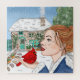 Handgezeichnete Kunst. Der erste Schnee. Eine Dame, die einen Kardinal an einem schneebedeckten Wintertag vor einer englischen Hütte hält.