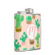 Ein Muster verschiedener Kakteen, die in verschiedenen Töpfchenfarben gepflanzt werden. Sie sind auf einem hellrosa Hintergrund platziert und von Kakteen-Nadelformen umgeben. Jeder Kaktus ist mit Aquarellen in hellgrünen Farbtönen gefärbt!