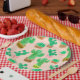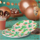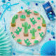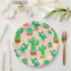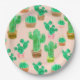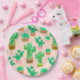 Ein Muster verschiedener Kakteen, die in verschiedenen Töpfchenfarben gepflanzt werden. Sie sind auf einem hellrosa Hintergrund platziert und von Kakteen-Nadelformen umgeben. Jeder Kaktus ist mit Aquarellen in hellgrünen Farbtönen gefärbt!