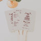 Creme- und rote Hochzeitsprogramm-Fächer im Doodle-Stil sind eine charmante und funktionale Möglichkeit, Gäste zur Trauung zu begrüßen und sie gleichzeitig kühl und informiert zu halten. Mit ihrer wunderlichen, handgezeichneten Kunst eines Champagner-Turms, der mit einem sich zuprostenden Paar gekrönt ist, verleiht dieses trendige Design Ihren Hochzeitsdetails eine spielerische und romantische Atmosphäre. Die reichen roten Illustrationen und Schrift-Akzente heben sich schön von dem weichen Creme-Hintergrund ab und schaffen eine warme, vintage-inspirierte Ästhetik. Perfekt für Hochzeiten im Freien, Gartenzeremonien oder andere Veranstaltungen in warmer Jahreszeit, enthält dieser doppelseitige Fächer auf der einen Seite die Details zur Trauung und auf der anderen Seite eine vollständige Liste der Hochzeitsgesellschaft. Der leicht zu haltende Holzgriff sorgt für Praktikabilität, während das illustrierte Design sich schön in andere Hochzeitselemente im Doodle-Stil einfügt. Ideal für Paare, die Persönlichkeit und aktuelle Design