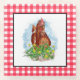Ein Huhn sitzend in Klee und Blume handgezeichnet Skizze. Niedliches Geschenk für deine Lieblings-Hühnermutter. Gelb und rot karierter Gingham zurück.