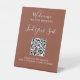 Elegant Handwritten script QR code burgundy wedding seating pedestal sign.