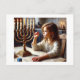 Ein junges Mädchen sitzt an einem Tisch und konzentriert sich auf die beleuchtete Menorah vor ihr. Die sanfte Kerzenlicht beleuchtet den Raum und schafft eine warme und intime Atmosphäre.