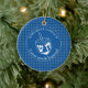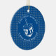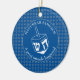 Stilvolles HANUKKAH SAMEACH Ornament mit Imitaten silberner Star von David in einem gefliesten Muster und einem großen weißen Dreifach in der Mitte. Die Hintergrundfarbe ist Tekhelet Blue. Der Text liest HANUKKAH SAMEACH oben, und am unteren Rand ein GROSSER WUNDER PASSIERT. Beide sind KUNDENBAR, wenn Sie durch einen Namen oder einen anderen Text ersetzen möchten. Teil der HANUKKAH Kollektion von Berean Designs.