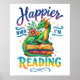 Lebhaftes, farbenfrohes Design mit einem offenen Buch, farbenfrohen Drachen und Blume. Der farbenfrohe Text lautet: "Happier wenn ich lese". Dieses Design ist auf einer Vielzahl von Produkten erhältlich.