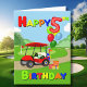 Ein leuchtend roter Golfwagen, der in die Geburtstagsszene hineinzoomt, sorgt für Spannung und Fröhlichkeit! Auf der Vorderseite befindet sich ein festlicher Golf-Kuchen, auf der Rückseite finden Sie bunte Geschenke und Ballons, die mit einem riesigen Ballon der Nummer 5 überragt sind. Mit fett gedrucktem, primärem Text ist diese Karte ideal, um einen besonderen Tag für einen kleinen Jungen zu feiern.