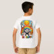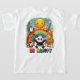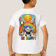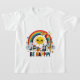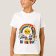 Ein reizender T - Shirt mit einem über den Himmel ragenden Regenbogen, mit bezaubernden Tieren - Pandas, Giraffen und Pinguinen - die hinter den bunten Streifen herausschauen. Die Sonne scheint hell, und der Text lautet: "Sei glücklich."