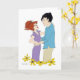Ein junges Mädchen mit rotem Haar und ein junger Mann mit schwarzem Haar halten sich und sind von gelben Blumen umgeben.