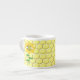 Diese phantastische Espresso-Tasse zeichnet sich durch ein grafisches Bild einer niedlichen gelben Hummel mit schwarzen Streifen, Augen, Antennen und Beinen aus. Es hat hübsche blaue und weiße Flügel. Die Biene sitzt inmitten einer goldgelben Sonnenblume. Die Blume hat einen grünen Stiel und drei Blätter. Die Meldung "Happy Bee Day" erscheint auf den drei Blätter verteilt. Der Hintergrund besteht aus einem gelben Wabenmuster.