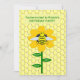 Diese phantastische Geburtstagsfeier-Einladung zeigt ein grafisches Bild einer niedlichen gelben Hummel mit schwarzen Streifen, Augen, Antennen und Beinen. Es hat hübsche blaue und weiße Flügel. Die Biene sitzt inmitten einer goldgelben Sonnenblume. Die Blume hat einen grünen Stiel und drei Blätter. Die Meldung "Happy Bee Day" erscheint auf den drei Blätter verteilt. Der Hintergrund besteht aus einem gelben Wabenmuster. Auf der Vorderseite und auf der Rückseite ist ein eigener Text, sodass Sie alle Party-Details einschließen können.