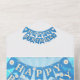 Dieses Bild ist ein lebendiges und festliches Geburtstagsgeschenk-Design. Es ist mit einem blauen, fröhlichen "Geburtstagsbanner" in cremefarbenen Buchstaben, mit kleinen weißen Blume dekoriert, ausgestattet. Der helle, hellblaue Hintergrund mit Lichtstrahlen, die von der Mitte ausgehen und ein strahlendes und fröhliches Ambiente verleihen.