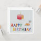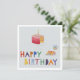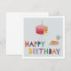 Diese helle und fröhliche Karte ist ein Ausdruck einer handgefertigten Collage, die einen Geburtstagskuchen und ein heißes Getränk mit lustigen, farbenfrohen Buchstaben darstellt.