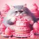 Ein süßes Kunstwerk einer fetten Katze, die einen rosa Geburtstagskuchen und Kuchen für jemanden genießt, der Katzen und Süßigkeiten Liebe!