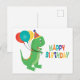 Niedliche Abbildung eines Dinosauriers, der drei Ballons hält und einen Geburtstagshut trägt!