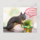 Ein lächelndes Eichhörnchen versucht, ein hell umhülltes Geschenk in diesem originalen Foto zu entpacken. Die Worte "Happy Birthday" sind in einer Sprechblase.