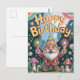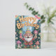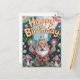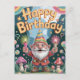 A vibrant and cheerful digital birthday card illustration featuring a friendly, elderly gnome. The gnome wears a colorful striped party hat and holds two lit birthday candles while standing in a magical forest clearing. Large, bubbly 3D text at the top reads "Happy Birthday". The background is filled with whimsical elements like pink and red spotted mushrooms, colorful bubbles, glowing stars, and rainbow-like swirls.
