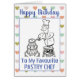 Konditorei Koch Cartoon. Die Frau steht oben auf einer Stepladder, die einen Kuchen vereist. Personalisieren Sie mit Ihrer Wahl des Wortlauts und der Insider-Nachricht. Geburtstagskarte für einen Koch.