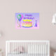 Feiern Sie die Geburtstage Ihrer Familie und Ihrer Freunde mit diesem farbenfrohen Happy Birthday Poster. Ein zweilagiger Geburtstagskuchen mit Kerzen ist von Ballons und einem gestreiften Party umgeben. Die Farben sind rosa, hellblau, grün und gelb.