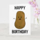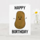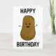 Niedliche, braune Cartoon Kartoffel mit Stangen Armen, ein großes glückliches Lächeln und Augendots. Auf der Vorderseite der Karte steht "Happy Birthday" in schwarzem Text. In der Karte ist eine Vorlage, um Ihre eigene Nachricht zu personalisieren hinzufügen.