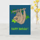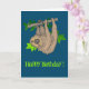 Ein Drawing of a brown sloth clinging to a branch with leaves, hanging upside down. Happy Birthday written in lime green grunge machen. Birthday message inside which you can change or customize if you wish.