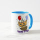Fijne verjaardag mok. Leuk om als cadeau te geven voor een verjaardag, Tekst: Happy Birthday Afbeelding: Oranje kat met twee ballonnen