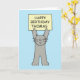 Eine große graue Cartoon-Katze, die ein Zitronenzeichen hochhält, das heißt "Happy Birthday Thomas". Das Bild hat einen himmelblauen Hintergrund.