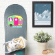 Jeder wäre ein glücklicher Camper in diesem trippigen, Wirblen, farbenfrohen, gelb-rosa lila-blauen Wohnwagen Camper mit runden Vorhangfenstern und einem Anhänger Anhänger. Personalisieren Sie die Worte Happy Camper in einem Retro-blauen Schriftart, um genau zu sagen, was Sie gewollt haben.