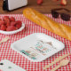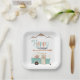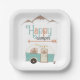Das Design der weißen Papiertafel beinhaltet den Text "Happy Camper", Boho-Stilpfeil, Silhouette und Trailer im Retro-Stil