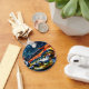 Schlucken auf einer Kopfsteinpflasterstraße in einer alten chinesischen Stadt mit Wolkenkratzern im Hintergrund. Design auf einfachem runden Schlüsselanhänger mit "Jahr der Schlange". Ideal für Chinesisches Neujahr der Schlange 2025 oder Geburtstag (Menschen geboren im Schlangenjahr).