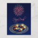 Happy Diwali Illustration : Un mandala doré avec Ganesha Rangoli et 5 diyas sur un arrière - plan bleu foncé avec feux d'artifice.