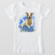 Fröhlicher Hund springt aus dem Shirt.