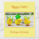 Modernes und farbenfrohes Weinetikett mit Osterküken und Ostereiern für ein festliches Geschenk.