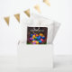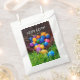Stilvolle Gefälligkeitstaschen sind mit farbenfrohen blauen, gelb-orangen, lila, grünen und rosa Ostereiern versehen, die aus einem dunkelbraunen Osterkorb auf grünes Gras übergehen. "Happy Oaster" wird oben in weißem Text geschrieben. Um den Fotograf Easter Egg Hunt Basket auf anderen Gegenständen zu sehen, klicken Sie auf den Link "Rocklawn Arts" unten.