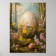 Grosses Osterposter mit einem großen Ostereier und niedlichen Tieren wie Osterhasen oder Kaninchen. Magische Fantasy Forest Blumenkunst mit Blume und bezaubernden Tieren. Große Ostereierjagd.