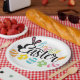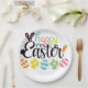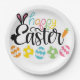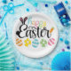 A Colorful Happy Easter Party Plates With A Cute Script Design Into A Rabbit With Eggs