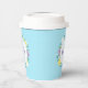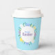 Happy Easter paper cups decorated with flowers and eggs on blue background