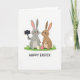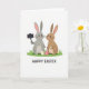This card shows two long-eared, bunny-like characters standing close together on a small patch of rich green grass, their bodies softly shaded in grey and warm brown. The grey figure on the left holds a small dark sign on a thin stick, angled slightly inward as if offering a sweet note to a friend 🐰. The brown figure leans toward it with a gentle, curious tilt and a tiny front tooth showing, giving the pair a tender, companionable look. Between them sit two decorated eggs: one bright white with scattered golden star shapes and another pink with neat white polka dots 🌷. The background stays plain white, keeping all attention on their closeness and the spring details at their feet. Centered below the illustration, the words “HAPPY EASTER” appear in dark, simple lettering. The text sits in a single line beneath the grass, with the dark sign above it remaining blank and rectangular.