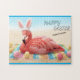 Send warm Easter greetings from Florida with this whimsical holiday jigsaw puzzle. The design features a pink flamingo with bunny ears lying in the sand on a pastel colored beach blanket surrounded by colorful easter eggs. The text reads "Happy Easter from Florida." The text may be edited for personalization at no additional charge. Please browse our complete collection of Florida themed Easter cards, gifts, and home decor. Special design requests accepted.
