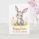 This greeting card features a sweet grey bunny sitting front-facing on a pale green wash of ground, surrounded by a few delicate yellow flowers on thin green stems 🌷. Its large dark eyes, long lashes, and rosy cheeks give it a tender, affectionate look, like it’s waiting for a hug from someone close 🐰. The bunny’s long ears stand upright with soft pink inner shading that matches its tiny pink nose. A small open mouth shows a hint of tongue, adding a gentle, friendly expression. Behind its left side, a fluffy round white tail peeks out against the light background. The background stays mostly white with soft, watercolor-like textures and no harsh shadows, keeping the focus on the bunny and flowers. Beneath the illustration, “Happy Easter” appears in orange lettering, with “TO A SPECIAL GRANDSON” printed below in smaller warm brown text. The yellow blossoms sit lightly across the lower scene, while the bunny’s ears reach upward into the open white space.