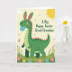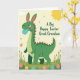 This card shows a tall, friendly green creature with a bunny-like shape and reptile touches, standing front and center with long ears and small red spikes along its back 🐰. Its big eyes and light blush give it a tender, caring look as it gently holds a striped blue egg in its mouth, like it’s bringing a little gift to someone special. Behind it, a creamy yellow sky sets a sunny daytime scene with a bright sun in the upper right and soft clouds drifting nearby. A rolling green hill stretches across the bottom, filled with fine grass blades, tiny yellow flowers, and a few thin brown reeds that add texture. Several decorated eggs in pink, yellow, and blue are scattered around the grass, each with simple stripes and wavy patterns that suggest a cheerful Easter search 🐇. The message “A Big Happy Easter Great Grandson” is placed prominently across the lower area in large lettering that stands out against the green foreground. The text uses a strong, easy-to-read style in a dark tone, with the words spaced to fill the width of the design. In the foreground, the patterned eggs sit among the grass and little yellow blooms beneath the creature’s feet.