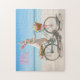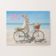 Happy Easter Hilton Head Style! The design on this cheerful holiday jigsaw puzzle features a whimsical Easter bunny wearing a festive spring-themed headdress and a basket overflowing with colorful painted eggs riding a vintage bicycle on a sun-drenched beach. The pink text reads "Happy Easter." The jigsaw puzzle is the perfect low-cost gift option for kids, grandkids, teachers, neighbors, co-workers, hostess, the elderly, and caregivers. Also a great addition to any Easter basket! Please browse our complete collection of Hilton Head and Lowcountry Easter cards, gifts, and home decor. Special design requests accepted.
