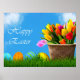 Osterfarben, sonniger Himmel, blühende Tulpen, "Happy Oaster".