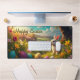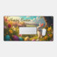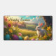 A picturesque spring landscape with rolling hills and blossoming trees stretches out in an idyllic, sunlit valley. A bright white Easter bunny sits attentively in the grass, surrounded by colorful, artfully decorated Easter eggs. The flowers in vibrant colors and the warm golden light of the setting sun lend the scene a peaceful and festive atmosphere. The elegant lettering "Happy Easter" hovers above the scene, underlining the festive mood.
