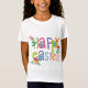 A bright and cheerful Easter design bursts across the front of this white T‑shirt, featuring the phrase “HAPPY EASTER” in playful, multicolored letters. Each letter is decorated like a festive Easter egg—striped, dotted, patterned—creating a lively, celebratory look. Surrounding the text are charming spring florals and leafy accents in pink, green, purple, orange, and yellow, adding a fresh seasonal touch. The overall feel is joyful, modern, and perfect for welcoming spring.