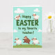 Made to share a spring holiday scene set against a pale blue sky, where five cartoon sheep with soft, fluffy coats and gentle faces gather around a friendly message. In the center, the words “Happy EASTER to my favorite teacher!” sit large and easy to read in rich green lettering. One sheep springs near the top left as if showing off for a friend, while another perches on a letter at the upper right with a fond, steady gaze. Along the bottom, three more sheep romp across a rolling green hill, including one in a warm brown tone beside two white companions, leaning close like a small group of pals. Four rounded white clouds float across the background, keeping the scene airy and light. Tiny flower shapes dot the foreground like early blooms 🌷, adding a gentle seasonal touch alongside the cheerful animals 🐰. The green hill curves along the lower edge with small floral accents sprinkled near the grass line.